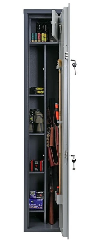 - В верхней части сейфа расположен трейзер (запирающееся на ключ отделение для патронов) размерами 198×296×140 мм. За узким трейзером остаётся свободное пространство, которое позволяет хранить ружья, по длине соответствующие высоте всего сейфа.