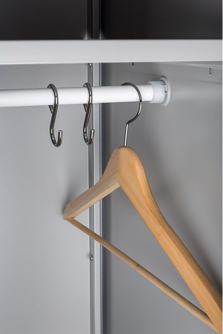 - Данная модель оборудована тремя полками, перекладиной для вешалок, крючками для одежды.