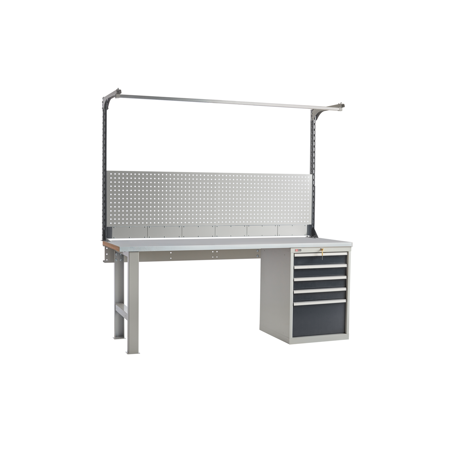 - Все металлические элементы верстака окрашены эпоксидной порошковой краской двух цветов: опора, стяжка и корпус тумбы – агатово-серый RAL 7038, ящики – антрацитово-серый RAL 7016. Такая краска защищает изделие от сколов, мелких царапин и предотвращает появления коррозии.